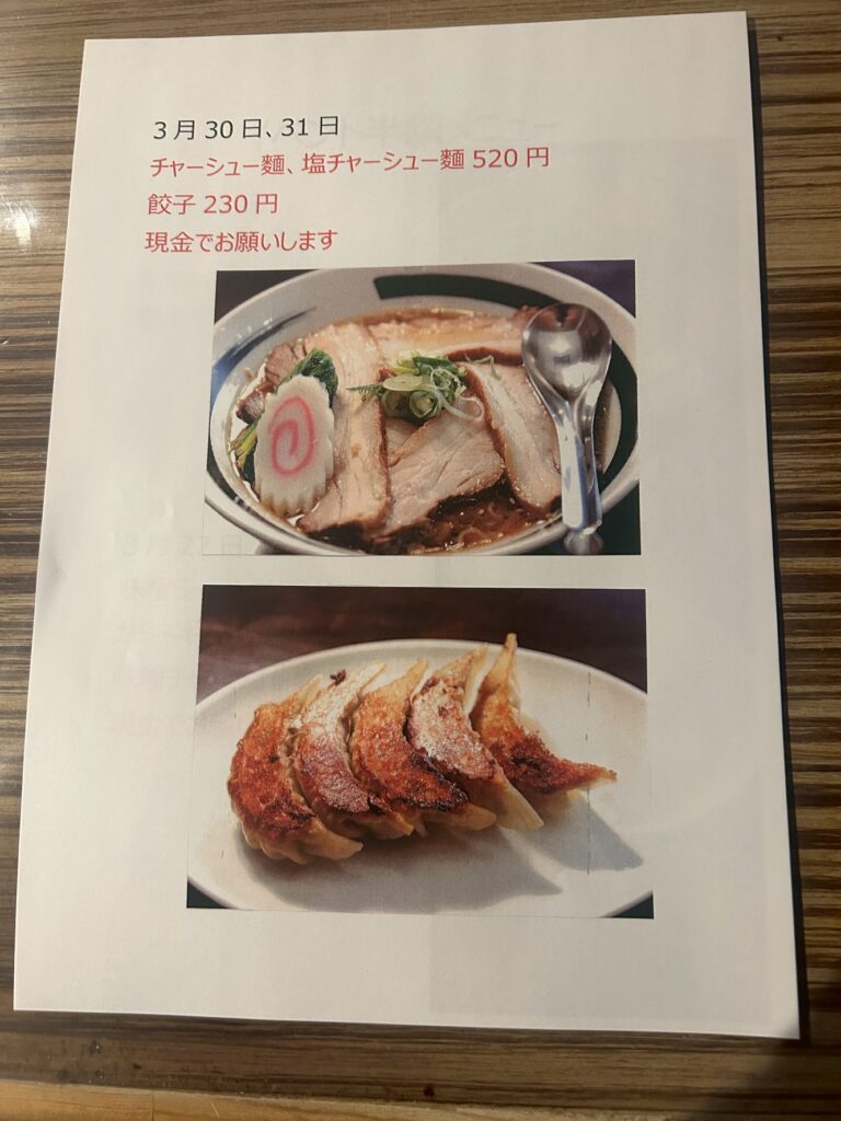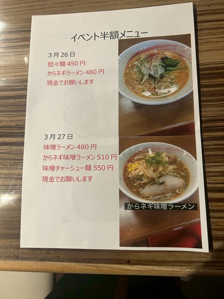 日時3月26日、27日、30日、31日で日替わり限定メニューを半額で提供いたします!